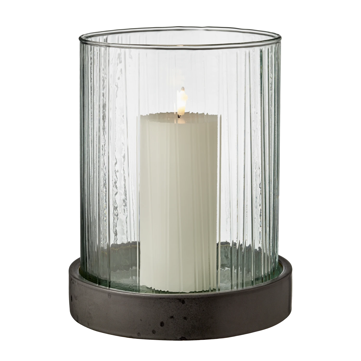 Der zylinderförmige Glasschirm hat eine geriffelte und rustikale Oberfläche, die wunderschön mit dem Licht spielt und es im farbigen Glas reflektieren lässt. Das Glas passt in den Sockel aus Steinzeug, der in der hübschen Kombination aus matter Außenseite und blanker Glasur auf der Innenseite gefertigt ist, die man auch aus der übrigen Steinzeug-Kollektion von BITZ kennt.
