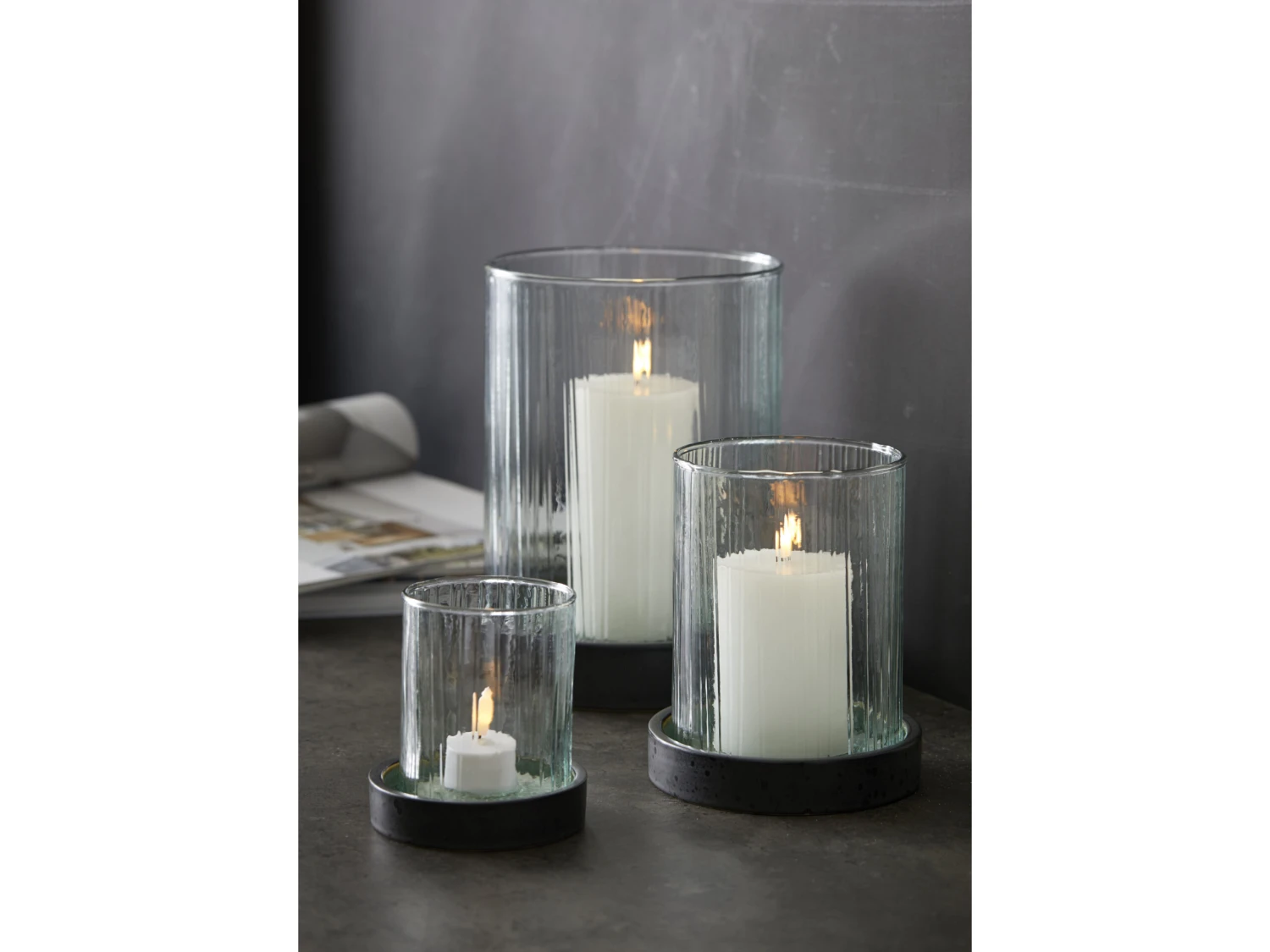 Schaffen Sie eine warme und gemütliche Atmosphäre mit hübschen Oasen aus Kerzen. Die BITZ Hurricane Lampe aus rustikalem Glas mit Sockel aus Steinzeug und einer LED-Stumpenkerze mit Timer ist eine hervorragende Wahl, wenn Sie sich Ruhe und Gemütlichkeit bei Kerzenschein wünschen. 24 cm hoch, grünes Glas und mattschwarz/glänzend grüner Sockel.