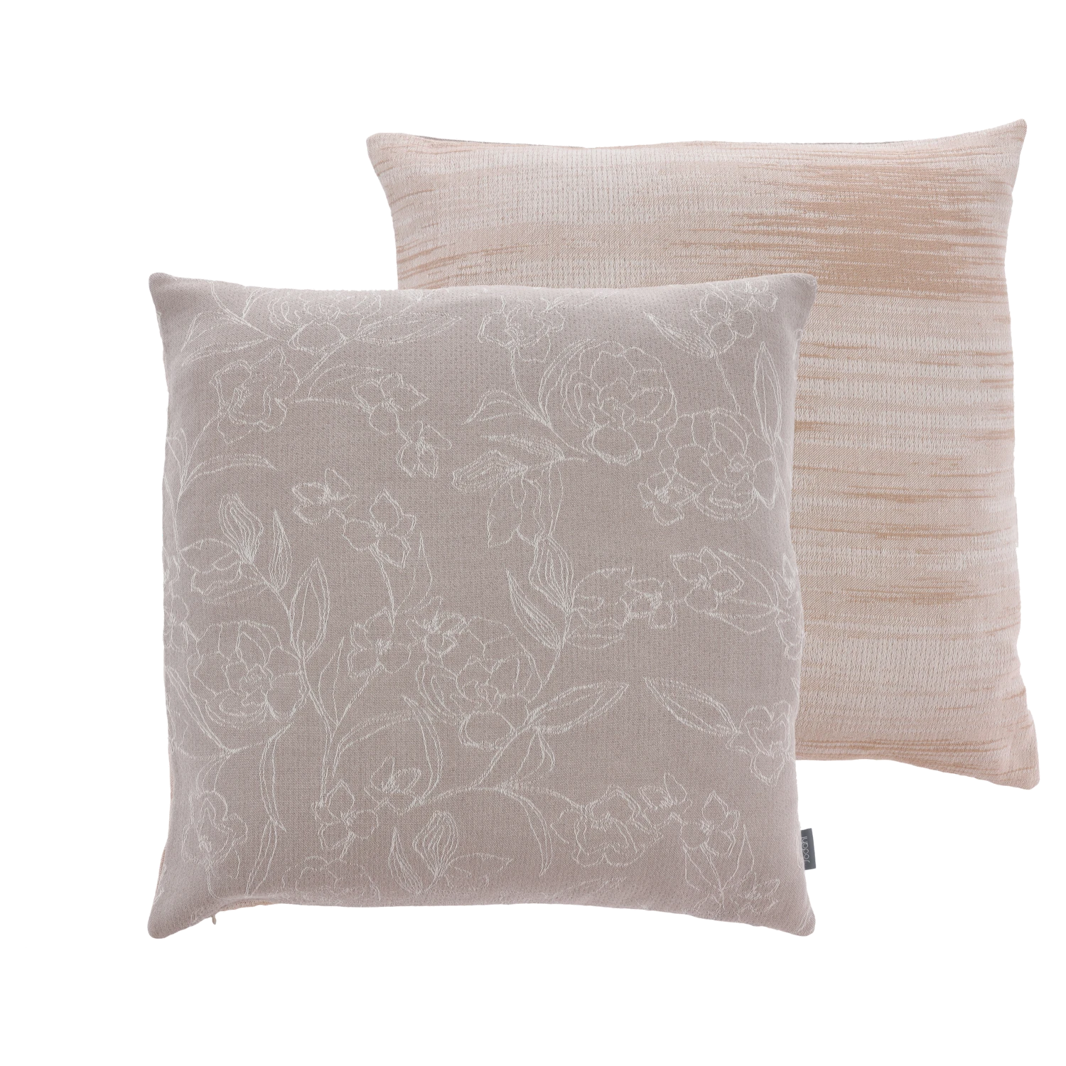 Die schlichten Blüten, mit nur einem Strich gezeichnet, bilden ein feines, fließendes und feminines Muster. Der handgezeichnete Stil und die ultrafeinen Linien auf dem monochromen Hintergrund sind beruhigend für das Auge. Sowohl das Kissen als auch das Plaid sind mit Doubleface-Effekt gearbeitet und die Rückseite zeigt ein hübsch graduiertes Melange-Motiv.