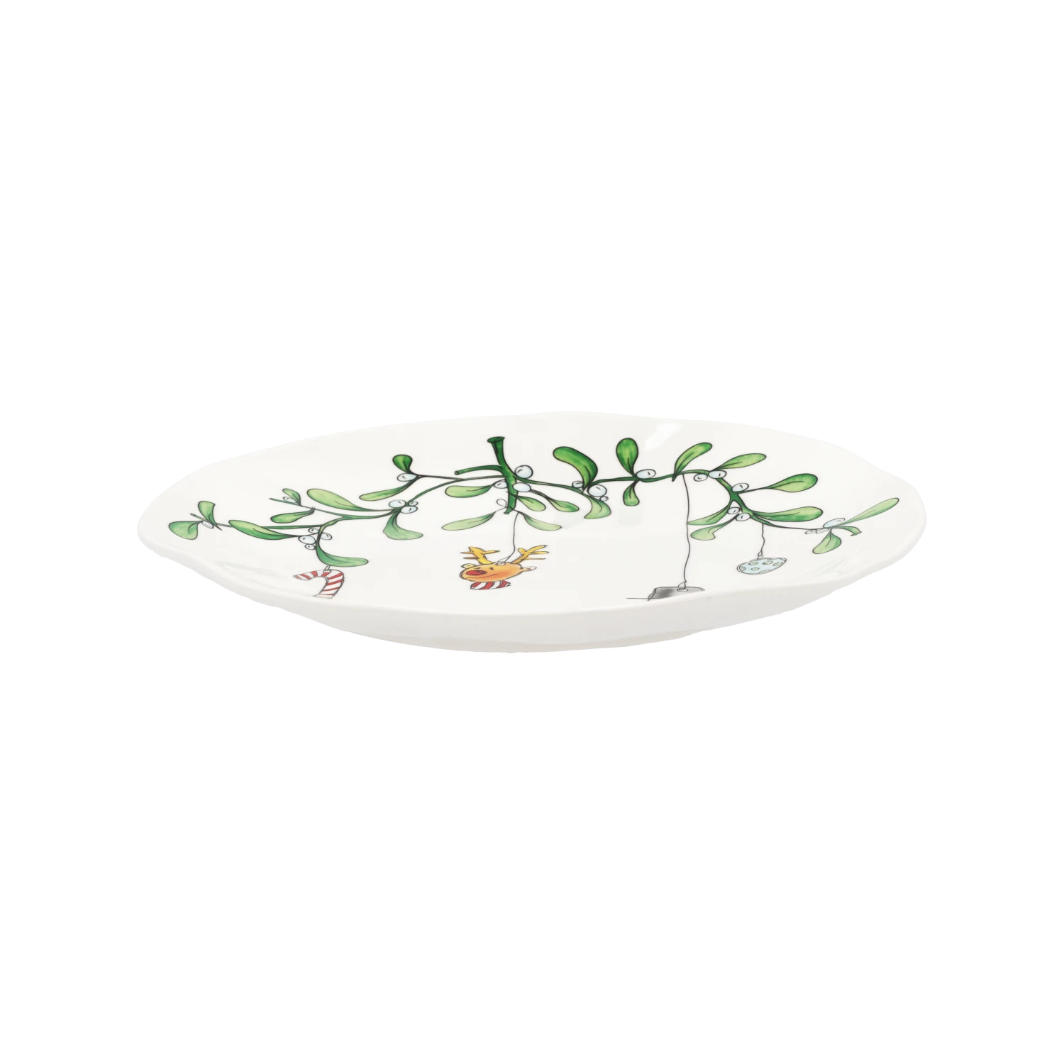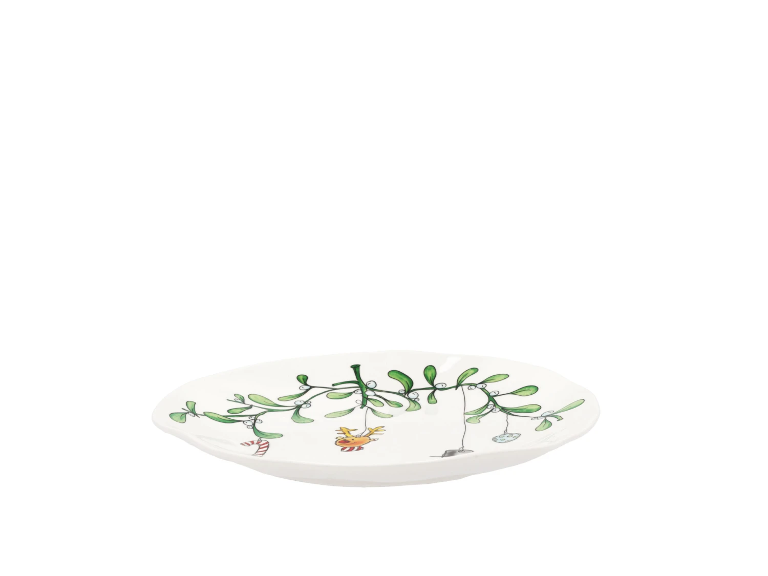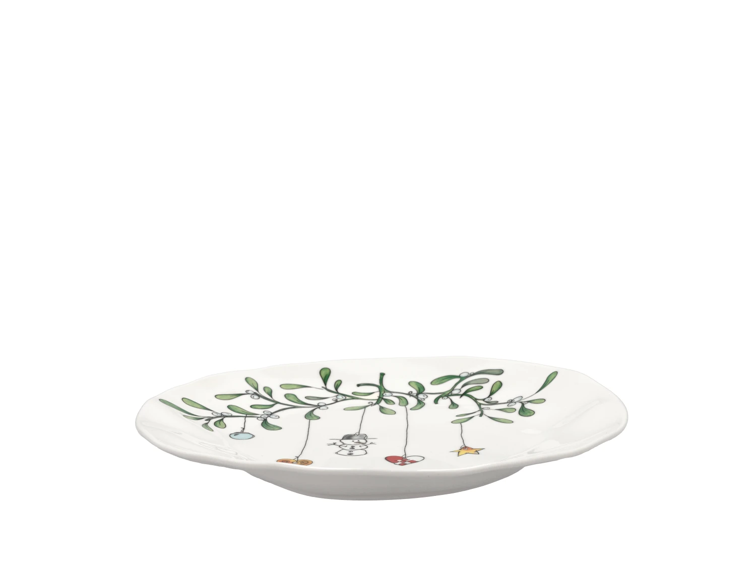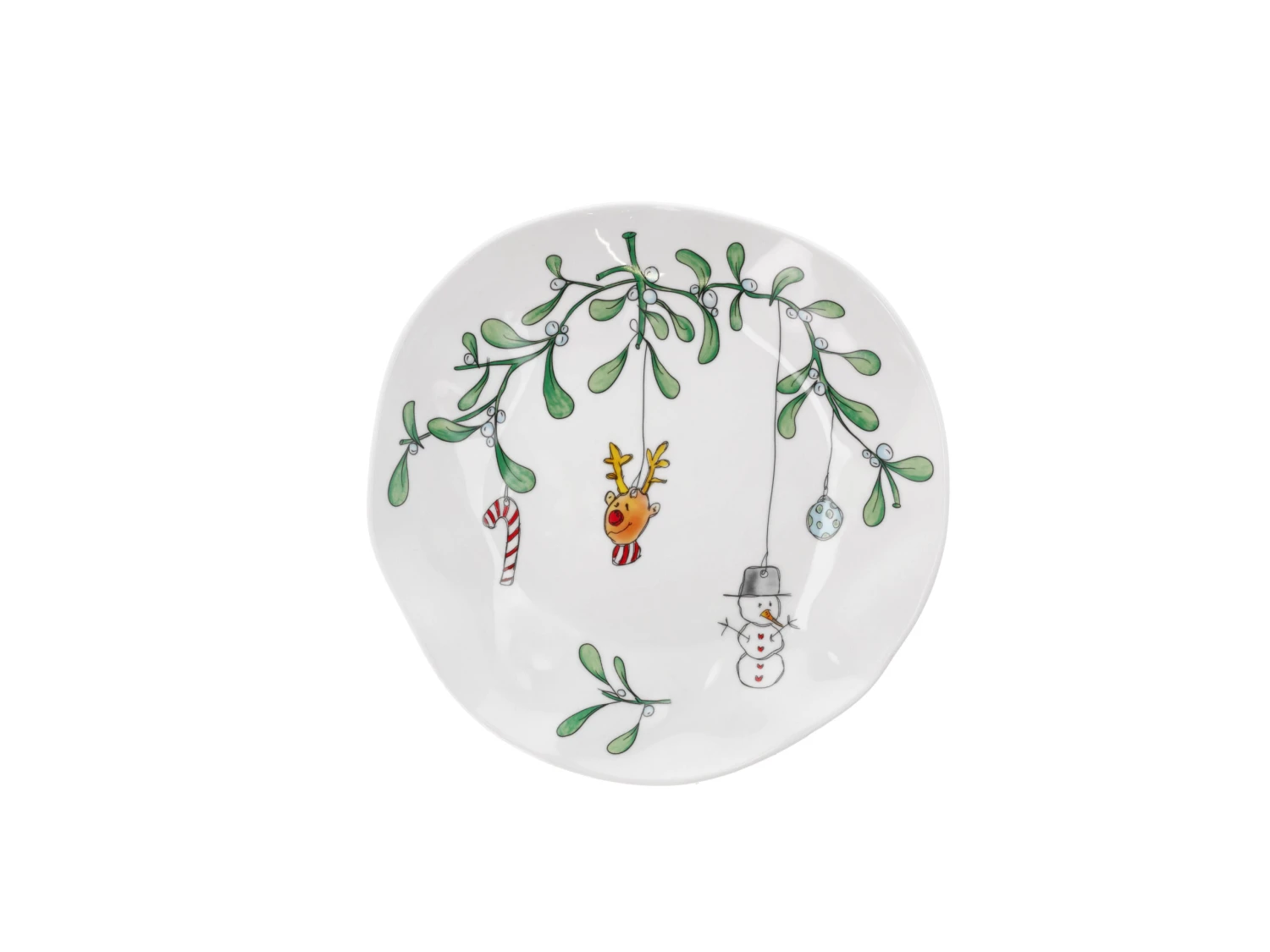 Niedliche Weihnachtsmotive hängen wunderschön von der zierlichen, grünen Mistel-Ranke herab und sorgen für Weihnachtsstimmung auf dem Weihnachtstisch. Machen Sie diesen wunderschönen Porzellanteller zu einem festen Bestandteil des Weihnachtstisches, wenn die Vorspeise, das Dessert oder das Weihnachtsgebäck serviert werden sollen. Durchmesser 21 cm.