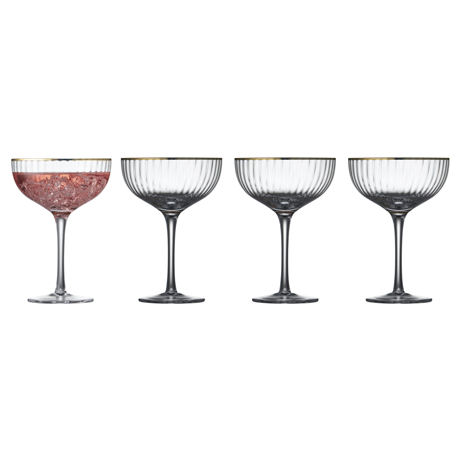 Hübsches Cocktailglas mit weichen, abgerundeten Formen. Das elegante, geriffelte Design mit hübscher Goldkante verleiht dem Glas einen tollen Vintage-Look, der gleichzeitig die Trends der Zeit widerspiegelt. Servieren Sie festliche Cocktails, Drinks oder Desserts in den Gläsern und die hübschen Facetten reflektieren das Licht und den Inhalt der Gläser auf wunderhübsche Art und Weise. 31,5 cl. Set mit 4 Stck.