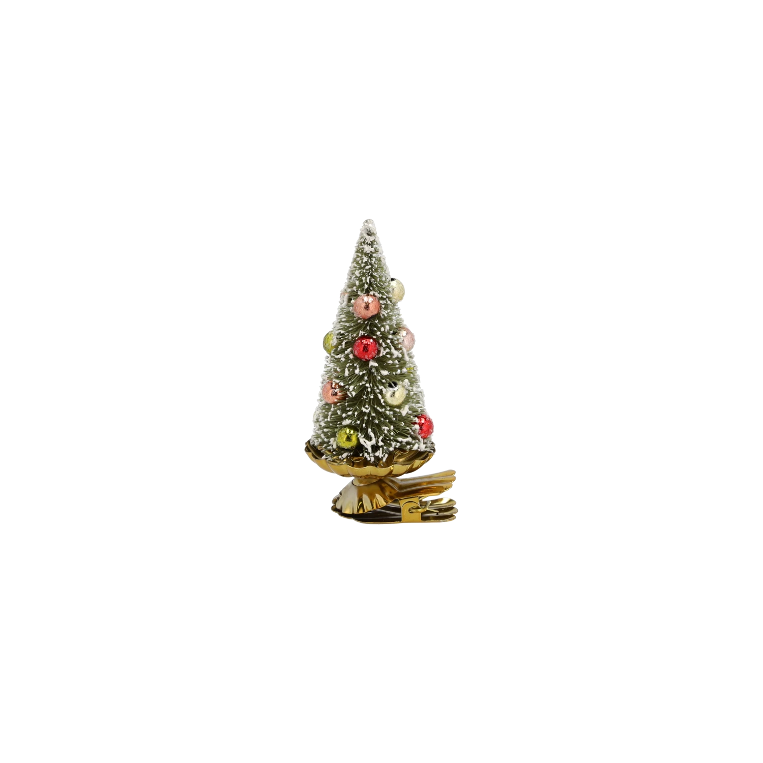 Vintage Weihnachtsbaum auf Clips mit hübschen Kugeln und einem Hauch von Weihnachtsschnee, der für gemütliche Stimmung in jedem Zuhause sorgt.