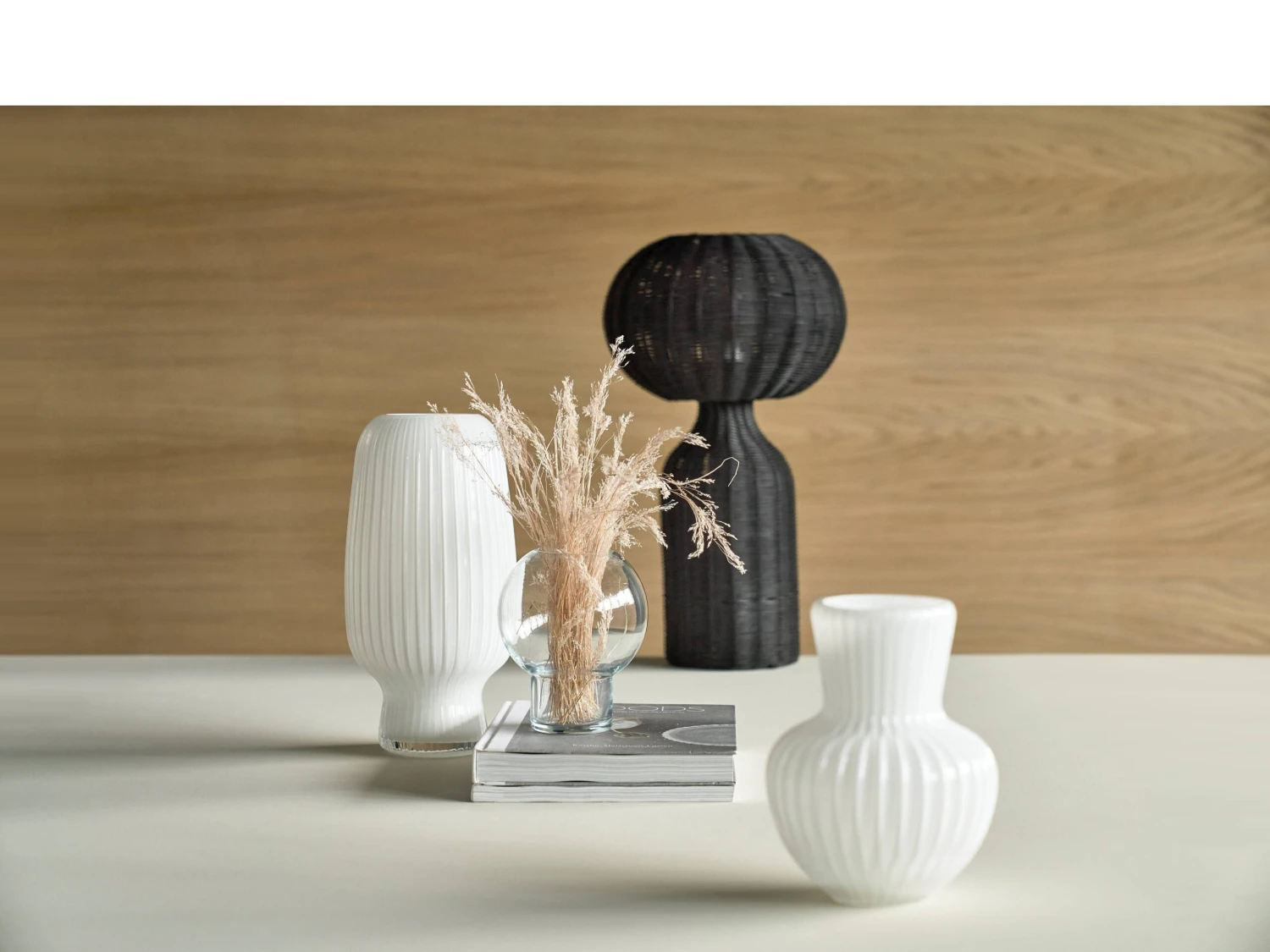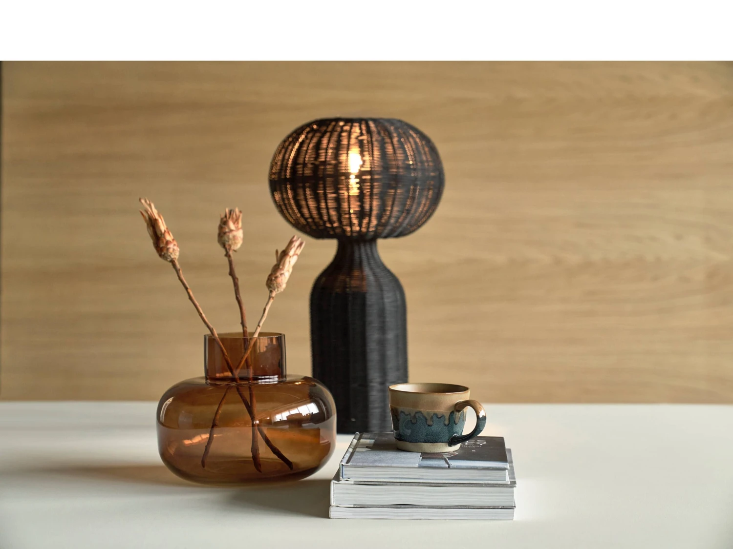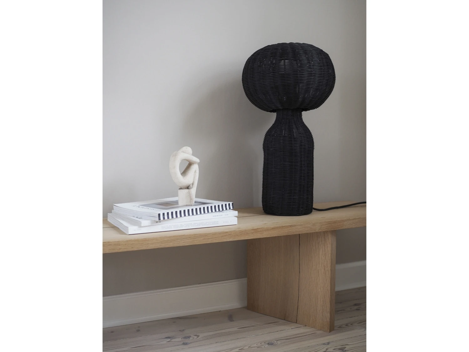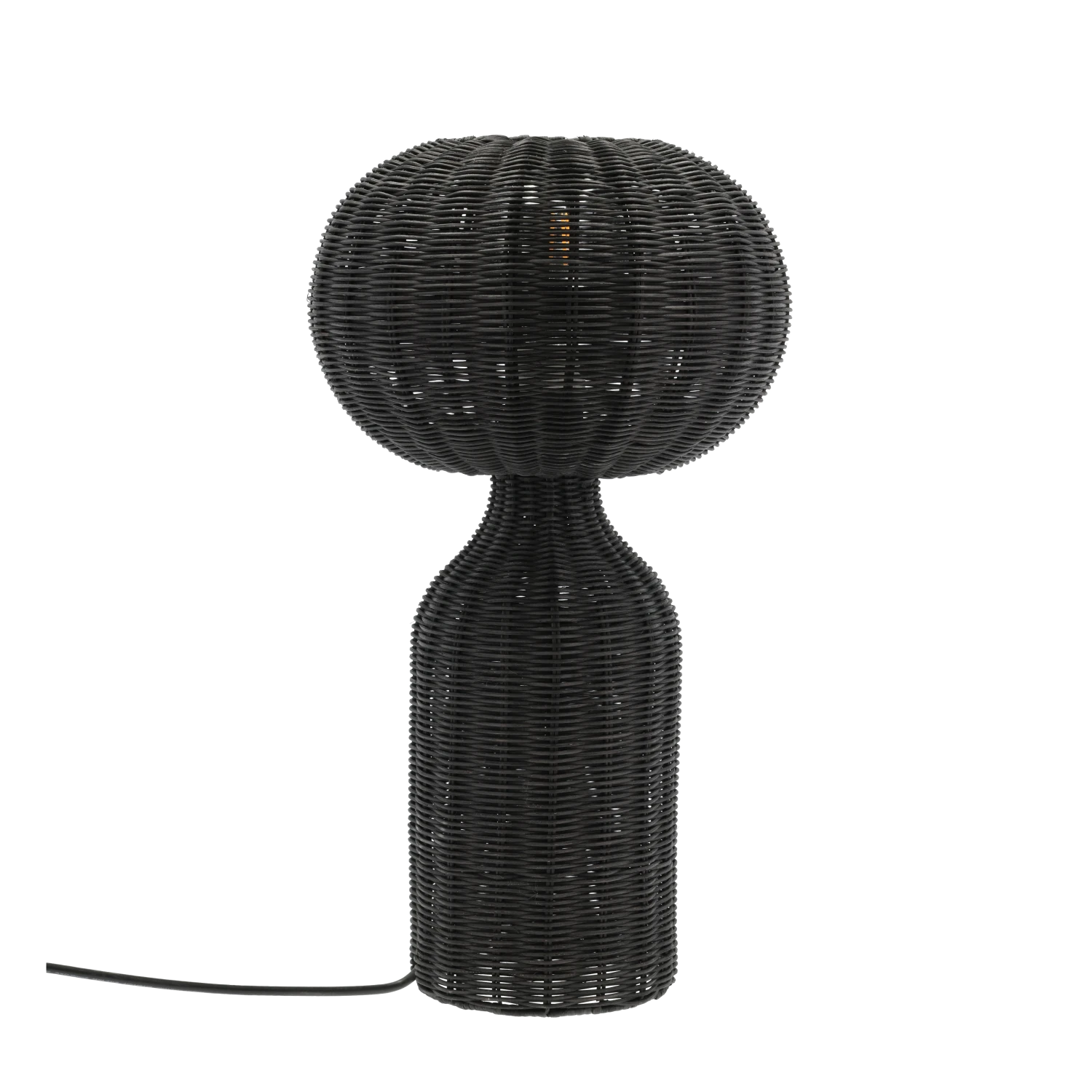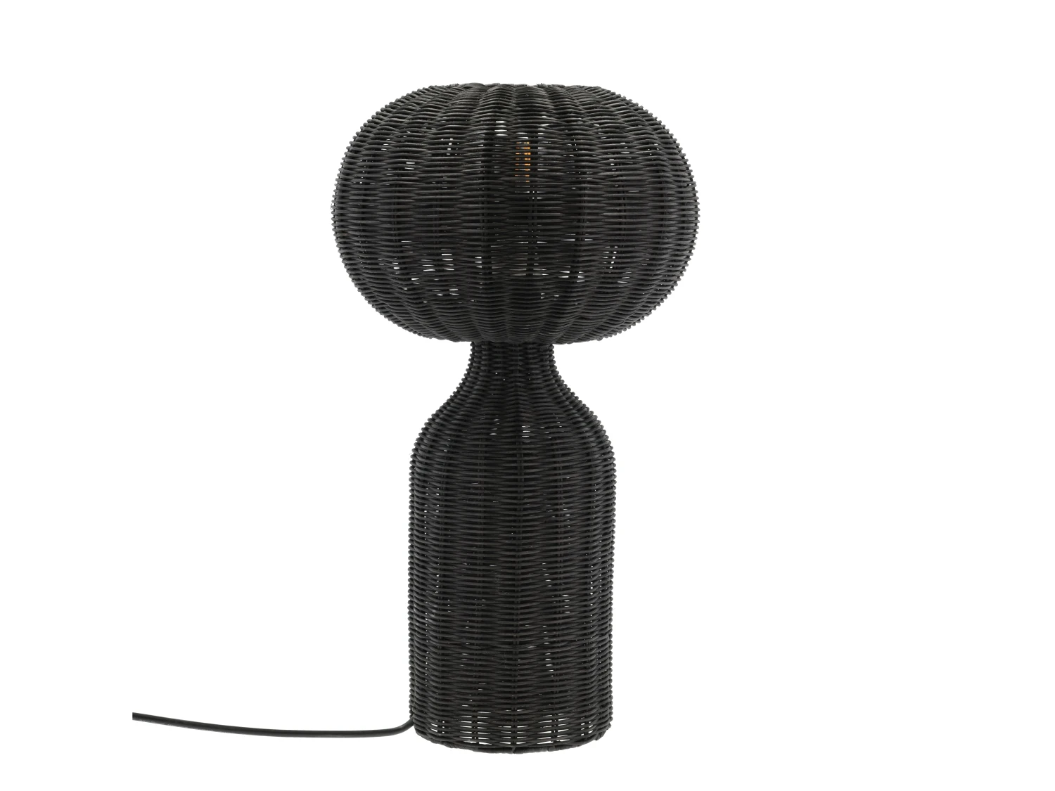 Tischlampe aus schwarzem Rattan. mit weichem und elegantem Licht. Ein tolles und warm leuchtendes Detail, das in jede kühle skandinavische Einrichtung passt. Mit 2 m langem schwarzem Polyesterkabel und E27 Fassung. D 30 x H 53,5 cm.
