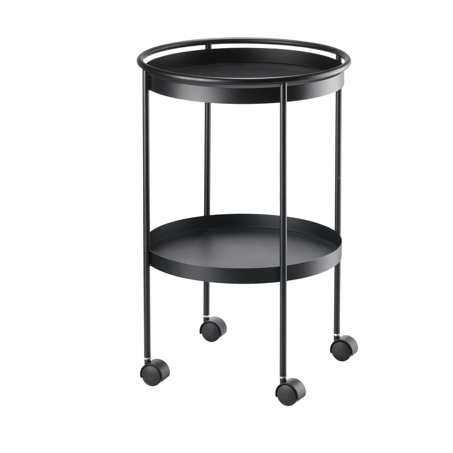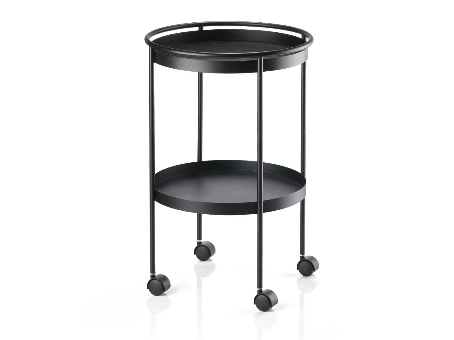 Füllen sie das Mini Bar auf, und stellen sIe wo die Gäste sind. Das Kleine runde Tisch mit Rollen von Zone hat eine zuzäliches regal und bietet somit viel Platz für Flaschen, Gläser, Eiskübel und Snacks und kann bequem hin und her geschoben werden. Höhe 57 cm Diameter 40 cm, Metall mit Schwarzes Coating.