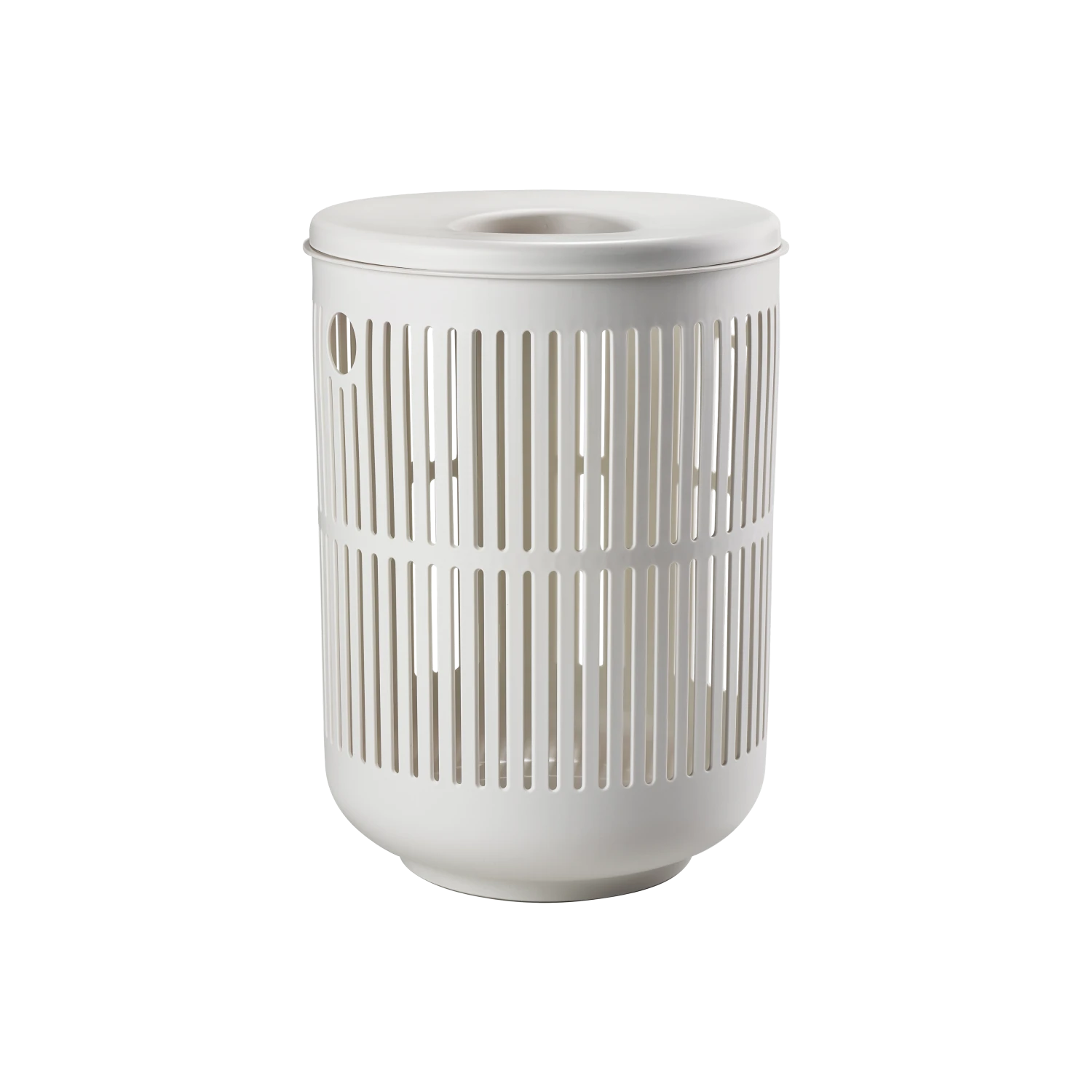 Organisch und praktisch – so leicht lässt sich der Wäschekorb aus der Serie Ume von Zone beschreiben. Mit diesem Korb behält man die Wäsche im Griff. Der Deckel lässt sich leicht abnehmen, was aber nicht immer erforderlich ist. Denn Strümpfe und andere Kleinigkeiten können ganz einfach durch das Loch in der Mitte hineingeworfen werden. Zwei kleinere Öffnungen an den Seiten dienen als Griff beim Versetzen des Wäschekorbs.